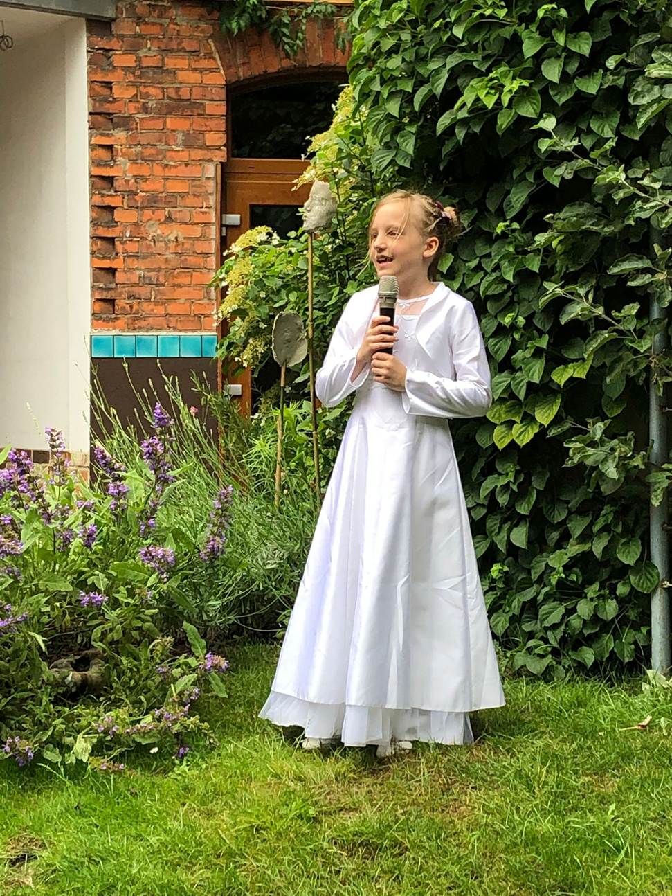 Am Sonntag war Anikes Erstkommunion. Der Gottesdienst war ansprechend gestaltet; Hans Gerd und Michael konnten ihre Stimmen erdröhnen lassen. Nach der Gruppenphotographie bei einem Glas Sekt ging es zum hervorragenden veganen Büffet, Solche Familienfeste stärken das Zusammengehörigkeitsgefühl; denn die Wohnorte liegen doch ziemlich weit auseinander.