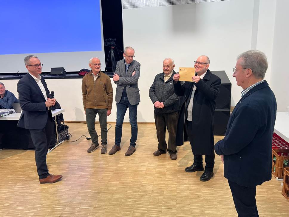 André Dora, Bürgermeister der Stadt der Stadt Datteln, hat mir die Prämie von 2.500 Euro als Heimatpreis für den Heimatausschuß des Bürgerschützenvereins Horneburg 1384 e. V. überreicht. Rechts neben ihm Alfons Garvert, Sebastian Elfert, Siegfried Eggenstein, Heinrich Michael Knechten und Wolfgang Wellnitz. Photographie von Wilhelm Müschenborn.
