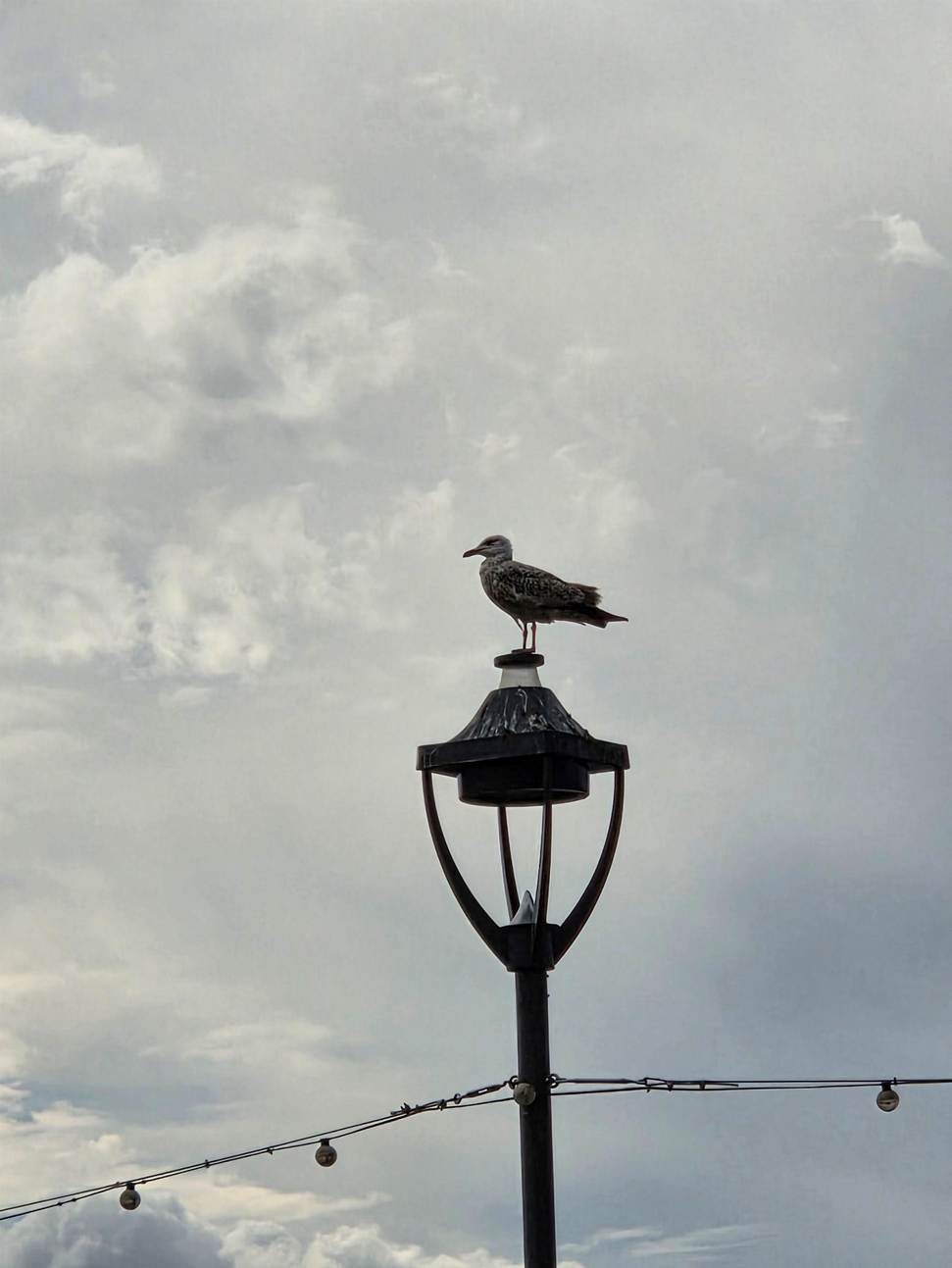 Diese Möwe auf einer Laterne am Hafen von Oban sieht aus wie eine Skulptur. Photographie von H. M. Knechten.