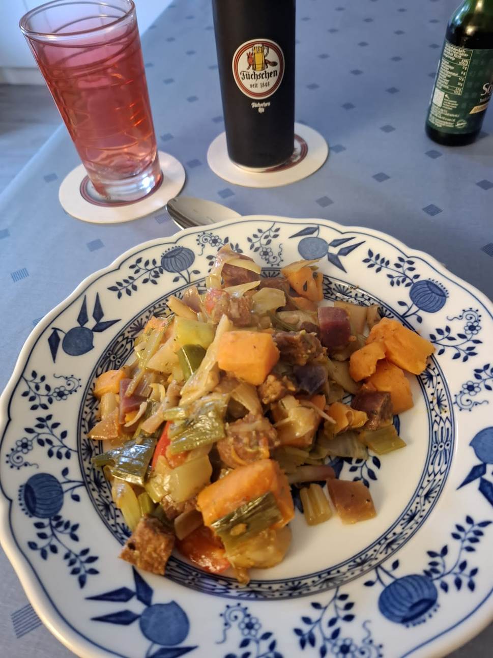 Ich jedoch verwende Chorizo oder andere Wurstsorten, Graupen, Lauch, Zwiebeln, Knoblauch, Stangensellerie, Kohlrabi, rote Beete, rote Paprika, Kürbis und eine geheime Gewürzmischung.