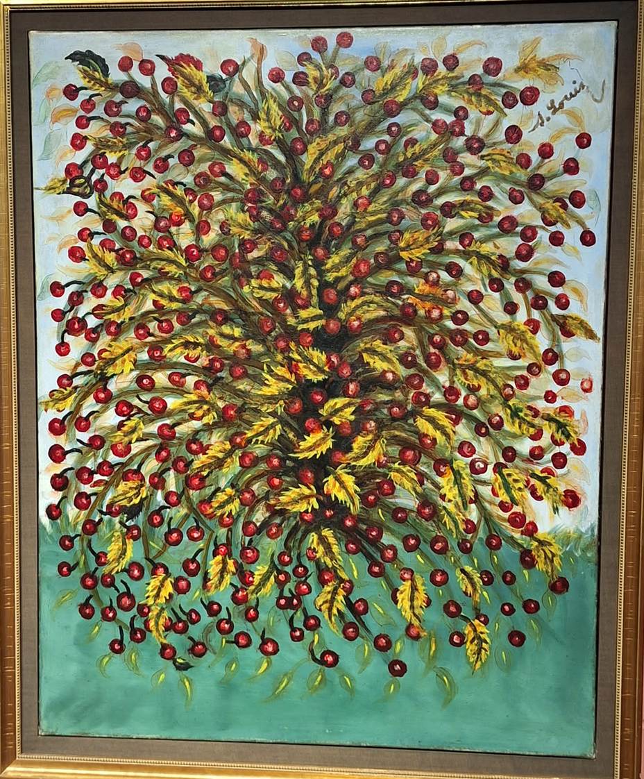 In Neuss war die Malerin Séraphine Louis zu entdecken. Nachdem sie als Laienschwester aus dem Kloster in Senlis entlassen worden war, arbeitete sie als Putzfrau und kam durch eine innere Inspiration zur Malerei. Im gezeigten Bild stellte sie Kirschen und welke Blätter zugleich an einem Baum dar: Leben und Tod, Frühling und Herbst, Fruchtbarkeit und Verlöschen. Ihre als „naiv“ bezeichneten Bilder enthalten eine tiefe und berührende Botschaft.