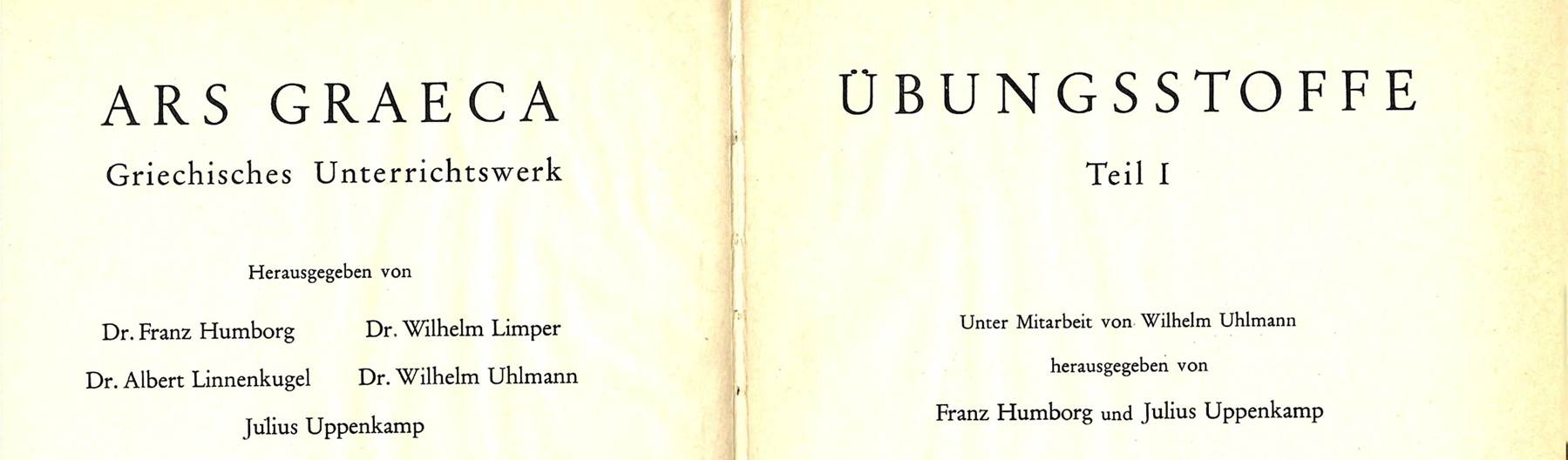 o Humborg, Franz (1885-1947), und Julius Uppenkamp, Herausgeber, unter Mitarbeit von Wilhelm Uhlmann, Ars Graeca. Griechisches Unterrichtswerk, Übungsstoffe, Teil I: Laut- und Formenlehre, Paderborn 1949.