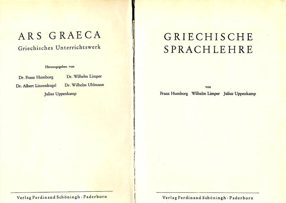 o Humborg, Franz, Wilhelm Limper und Julius Uppenkamp, Ars Graeca. Griechisches Unterrichtswerk. Griechische Sprachlehre, Paderborn 1948.