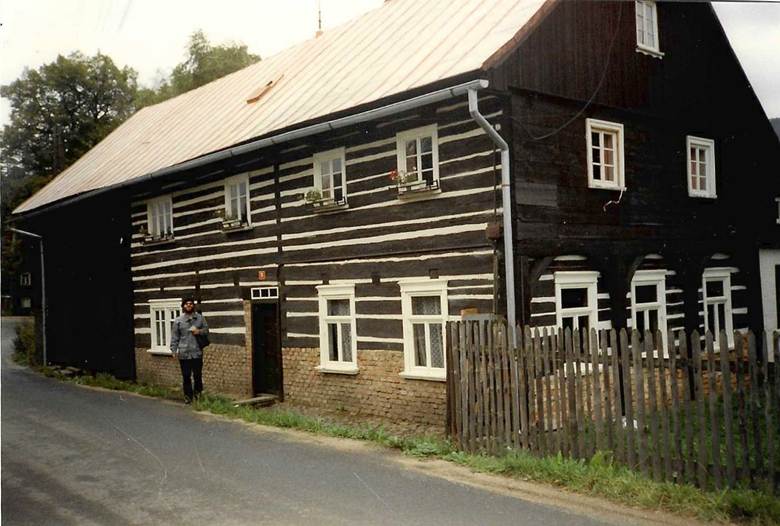 Großvater Hermann erbaute 1932 dieses Haus in der von ihm begründeten „Kunstgärtnerei“ in Deutsch-Gabel, Bahnhofstraße 462. Auf dem Weg mein Vater. Photographie 1990 von H. M. Knechten.