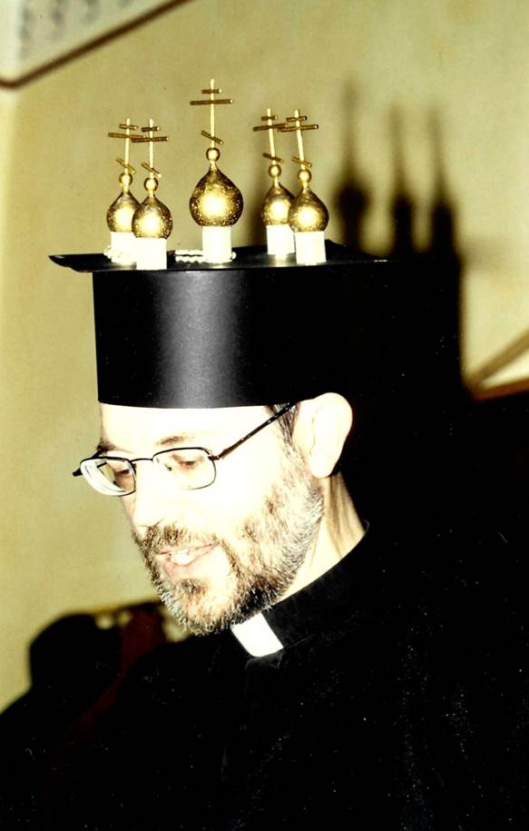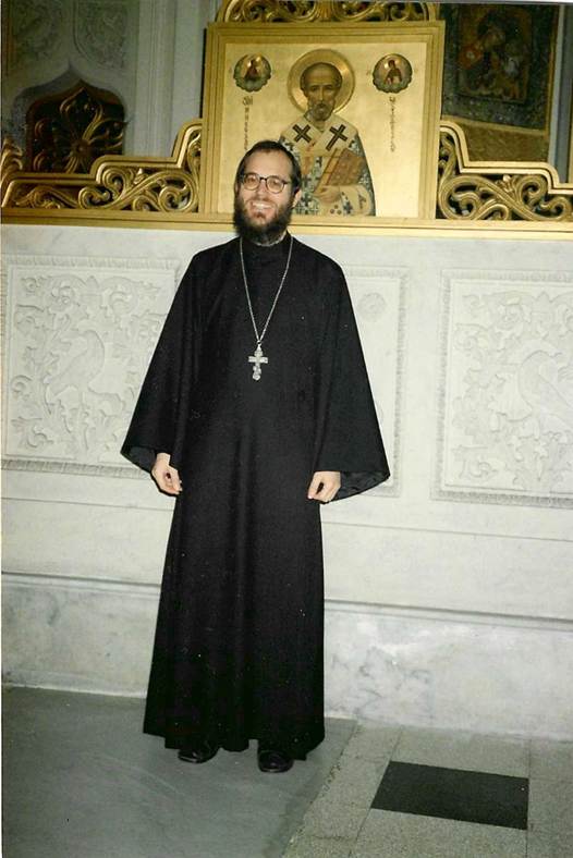 Rom, 1990, Collegium Russicum, Kirche des heiligen Andreas, Piazza Santa Maria Maggiore 7, vor der Nikolausikone, mit Rason (ряса) und silbernem Priesterkreuz