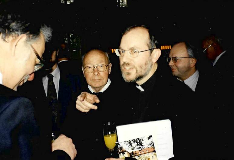 Münster, 6. Februar 1998, mit dem Doktordiplom und einem Glas Orangensaft, das jedesmal überschwappte, wenn mir jemand die Hand schüttelte. Es gratuliert der Dekan der Theologischen Fakultät, Prof. Dr. Udo F. Schmälzle OFM, in der Mitte Pfarrer Karl Bayer (1923-2001), rechts Dr. med. Klaus Günnewig. An diesem Tage der Feierlichen Promotion starb mein Vater im Marienkrankenhaus in Kevelaer. Diese Nachricht wurde mir erst am Schluß der Feier mitgeteilt.