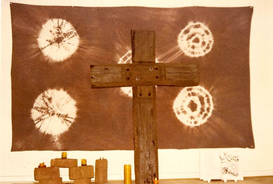 Dinslaken, 1980: Das Kreuz aus einer Eisenbahnschwelle im Meditationsraum vor einem Batiktuch