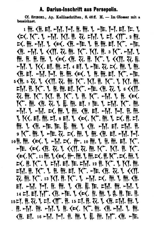 Darius-Inschrift aus Persepolis, in: Spiegel, Die altpersischen Keilinschriften, Leipzig 1862, 44-47; Bartholomae, Handbuch der altiranischen Dialekte, Leipzig 1888, 160f:
