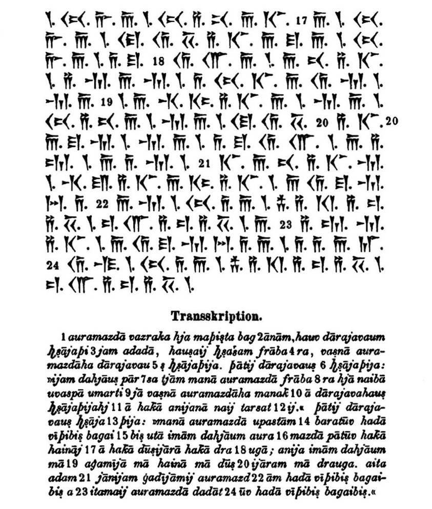 Der große Auramazda, welcher der größte der Götter ist, hat Darius zum König gemacht, er hat ihm das Reich verliehen; durch die Gnade Auramazdas ist Darius König. [Aura – Herr, mazdā – weise; Auramazda ist der Schöpfergott und der Herr des Lichtes sowie des Lebens.]