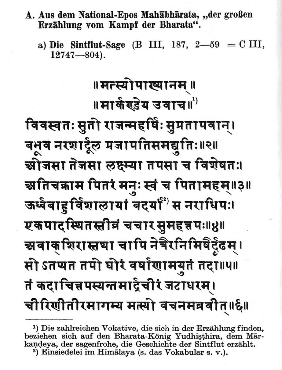 Mahābhārata, Sintflutsage, in; Albert Thumb, Handbuch des Sanskrit, Band II, Heidelberg 1978, 38.